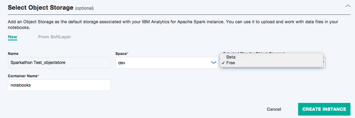 - Click "New Instance" and then set up your instance using the "Free" object storage option. (Please use the term "Spark" in your Object Storage instance name.)
